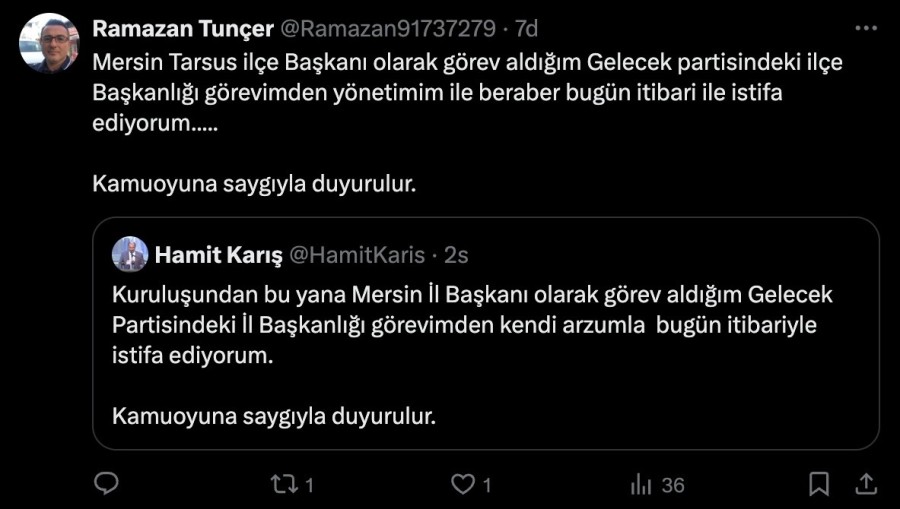 Karış'ın istifa açıklamasının ardından, Mersin'in Tarsus ilçesinden de istifa haberi geldi. Gelecek Partisi Tarsus İlçe Başkanı Ramazan Tunçer, ilçe yönetimiyle birlikte görevlerinden istifa ettiklerini duyurdu.