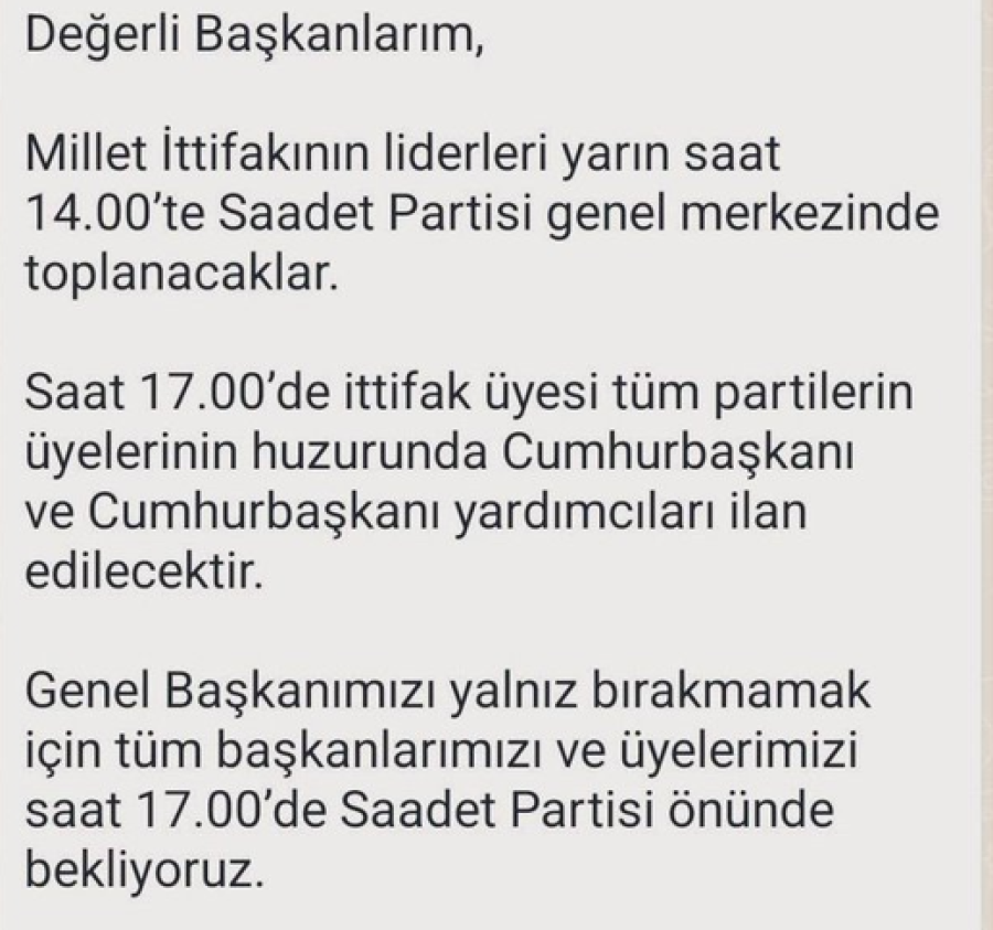 "Değerli başkanlarım, Millet İttifakı'nın liderleri, yarın (bugün) saat 14.00'te Saadet Partisi Genel Merkezi'nde toplanacaklar. Saat 17.00'de ittifak üyelerinin huzurunda cumhurbaşkanı ve cumhurbaşkanı yardımcıları ilan edilecektir.
