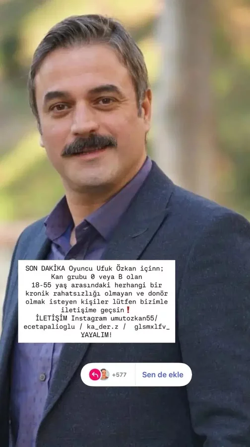 Ünlü isimlerin paylaştığı mesajda, "Son dakika! Oyuncu Ufuk Özkan için kan grubu 0 veya B olan, 18-55 yaş aralığında, herhangi bir kronik rahatsızlığı bulunmayan ve donör olmak isteyen kişilerin bizimle iletişime geçmesini rica ediyoruz" ifadelerine yer verildi. Paylaşımda ayrıca iletişim için Instagram hesapları da belirtildi.
