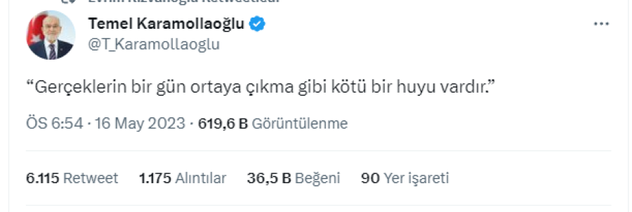 Karamollaoğlu, Twitter hesabından yaptığı paylaşımda "Gerçeklerin bir gün ortaya çıkma gibi kötü bir huyu vardır" ifadelerini kullandı.
