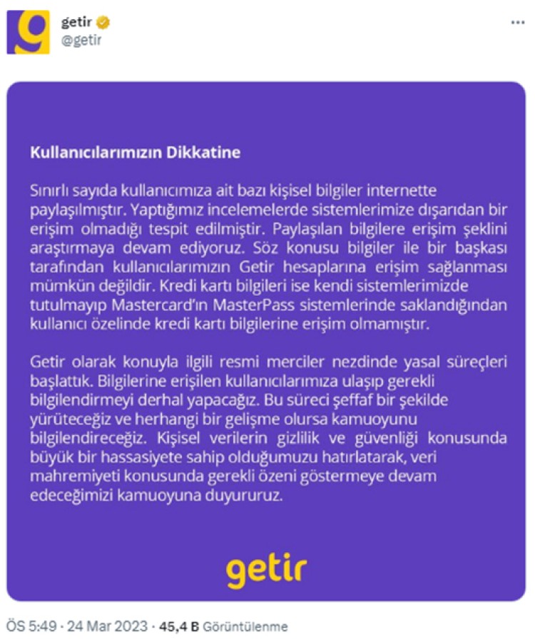 Getir'in sosyal medya hesabından konuya ilişkin açıklama yapıldı. Açıklamada bazı kişisel bilgilerin ele geçirildiği doğrulanırken, nasıl ele geçirildiğinin araştırıldığı vurgulandı.