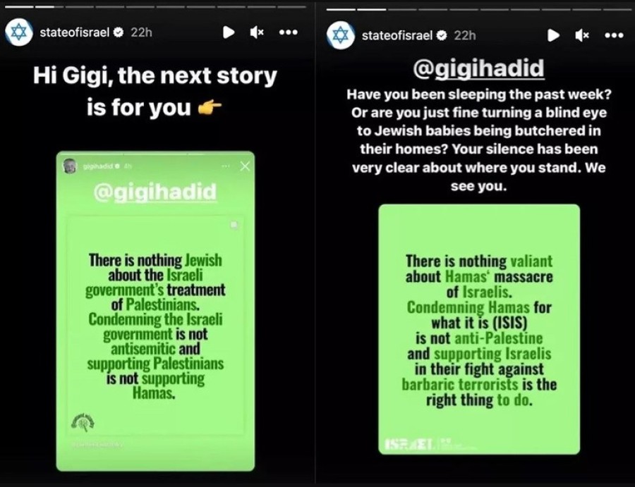 İsrail Devleti'nin hesabı daha sonra Hadid'in hesabını etiketleyerek ve 'Geçtiğimiz hafta uyudun mu? Yoksa Yahudi bebeklerin evlerinde katledilmesine göz mü yumuyorsun? Sessizliğiniz nerede durduğunuz konusunda çok açıktı. Seni görüyoruz" dedi.