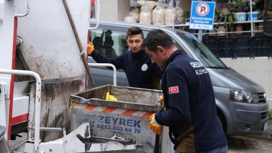 Temizlik aracının arkasına tutunan Başkan Köse, çöp konteynerlerini araca boşalttı, dökülen çöpleri topladı, yerleri süpürdü.