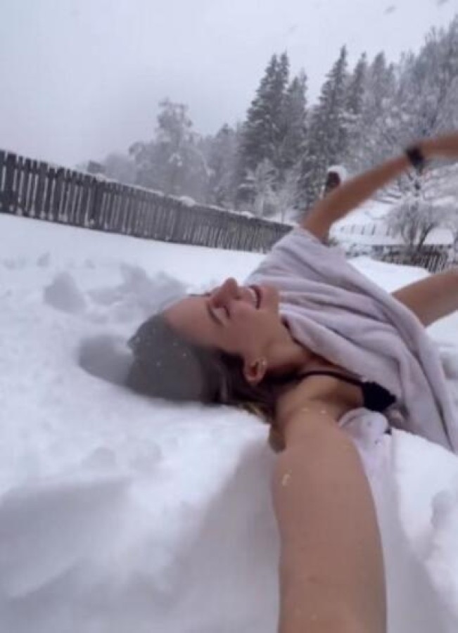 Buz gibi havada ve de herkesin şaşkın bakışları arasında bikini ile kendini karların içine bıraktı.