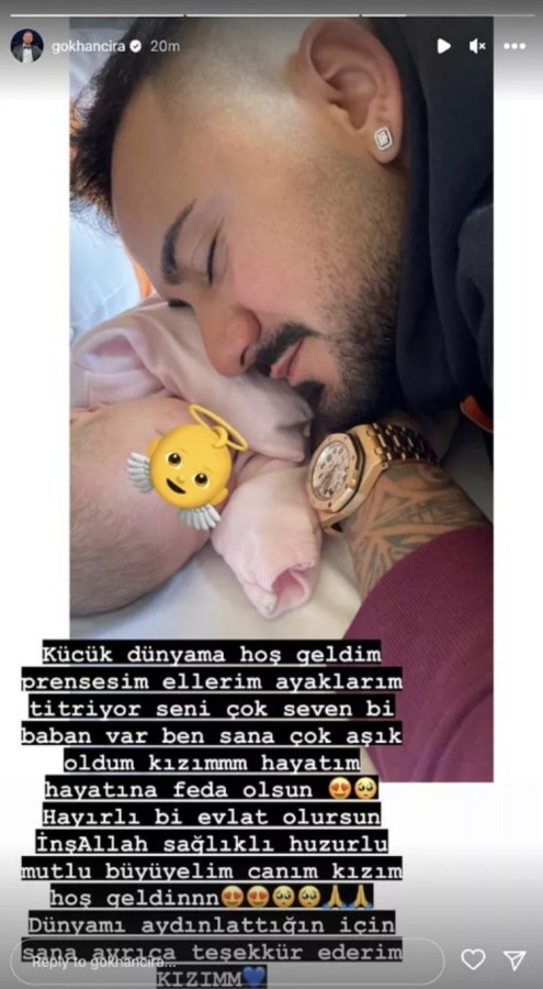 "Küçücük dünyama hoş geldin prensesim. Ellerim ayaklarım titriyor. Seni çok seven bir baban var. Ben sana çok aşık oldum kızım. Hayatım hayatına feda olsun. Hayırlı bir evlat olursun inşallah. Sağlıklı, huzurlu, mutlu büyüyelim canım kızım hoş geldin! Dünyamı aydınlattığın için sana ayrıca teşekkür ederim kızım."