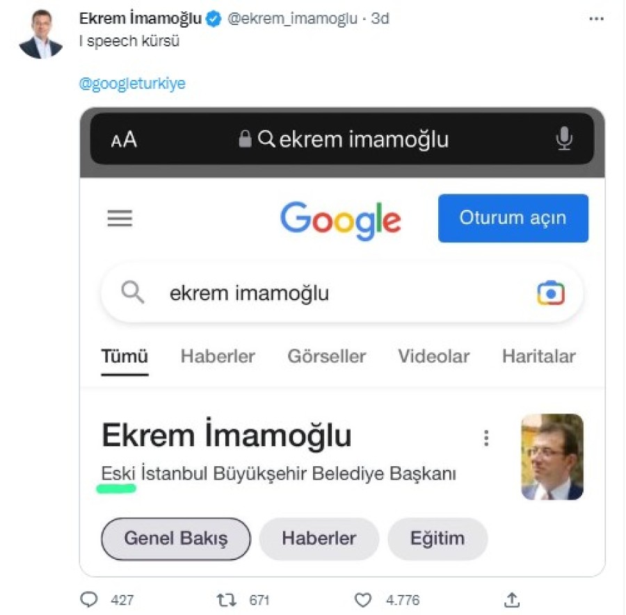 Ekrem İmamoğlu, Google'ı etiketleyerek verdiği cevapta Cumhurbaşkanı Erdoğan üzerinden gönderme yaparak "I Speech Kürsü" dedi..