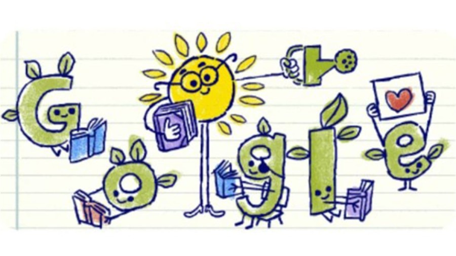 Doodle'da 'GOOGLE' 24 Kasım Öğretmenler Günü için kitap okudu. Kitap okuyan güneş ve ağaçlar da resmedildi.