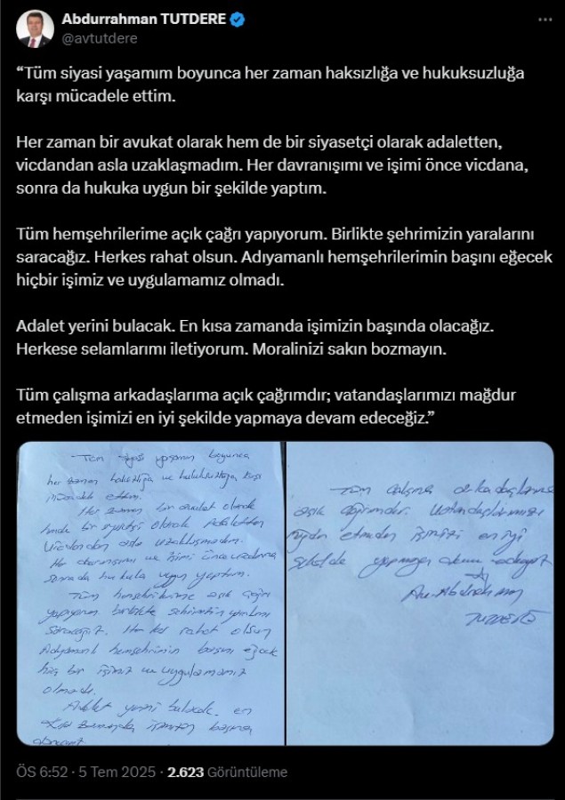Bugün gözaltına alınan Adıyaman Belediye Başkanı Abdurrahman Tutdere, "Tüm hemşehrilerime açık çağrı yapıyorum. Birlikte şehrimizin yaralarını saracağız. Herkes rahat olsun. Adıyamanlı hemşehrilerimin başını eğecek hiçbir işimiz ve uygulamamız olmadı" dedi.