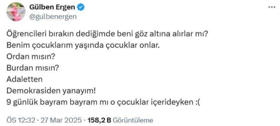 Ünlü şarkıcı Gülben Ergen sosyal medya hesabından yaptığı paylaşımda, "Öğrencileri bırakın dediğimde beni göz altına alırlar mı? Benim çocuklarım yaşında çocuklar onlar" ifadelerini kullandı.