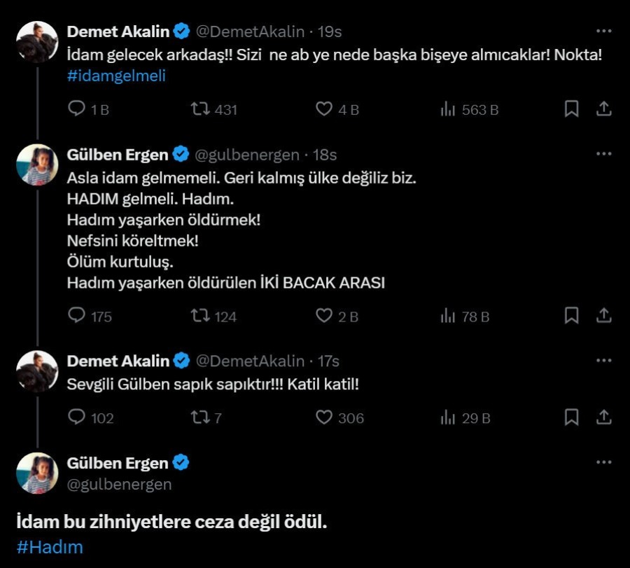 Türkiye'de kadına şiddet caydırıcı cezalar verilememesi nedeniyle artarak devam ediyor. Semih Çelik tarafından katledilen iki kadının ardından Demet Akalın, idamın gelmesi gerektiğini savunan bir mesaj attı. Gülben Ergen yanıt olarak idama karşı çıktı, hadım cezasını istedi.