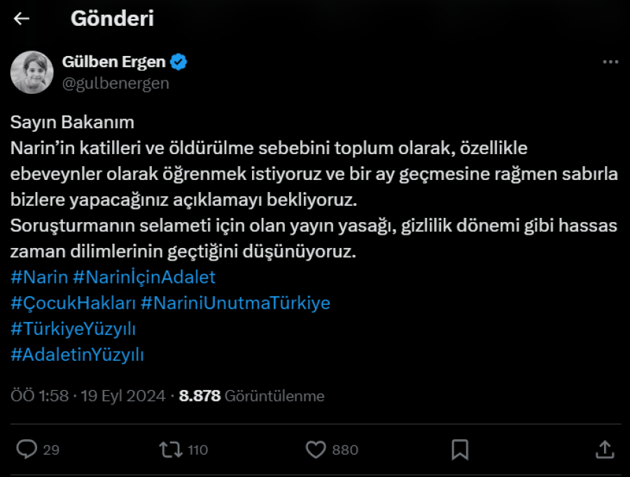 "Sayın Bakanım Narin'in katilleri ve öldürülme sebebini toplum olarak, özellikle ebeveynler olarak öğrenmek istiyoruz ve bir ay geçmesine rağmen sabırla bizlere yapacağınız açıklamayı bekliyoruz. Soruşturmanın selameti için olan yayın yasağı, gizlilik dönemi gibi hassas zaman dilimlerinin geçtiğini düşünüyoruz."