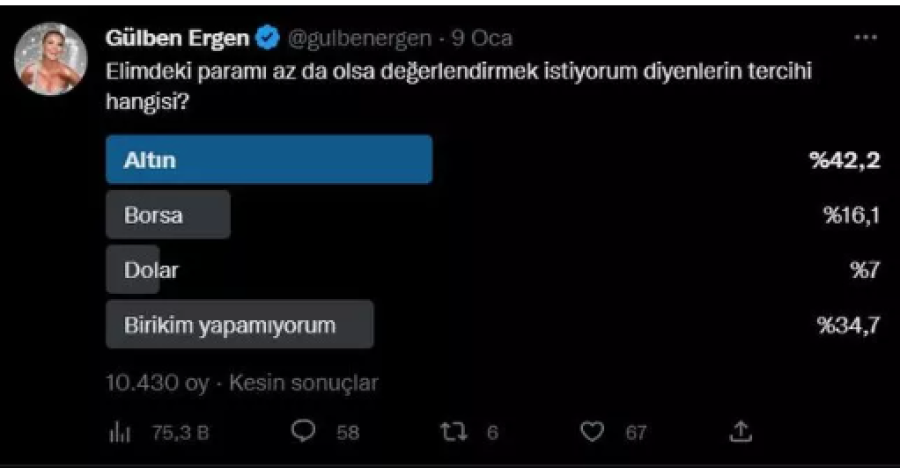 Şarkıcı Gülben Ergen, Twitter hesabından borsayla ilgili bir anket yapınca sosyal medyada dikkat çekti. Ergen günler önce ilk olarak "Elimdeki paramı az da olsa değerlendirmek istiyorum diyenlerin tercihi hangisi?" diyerek seçenekleri sıraladı.