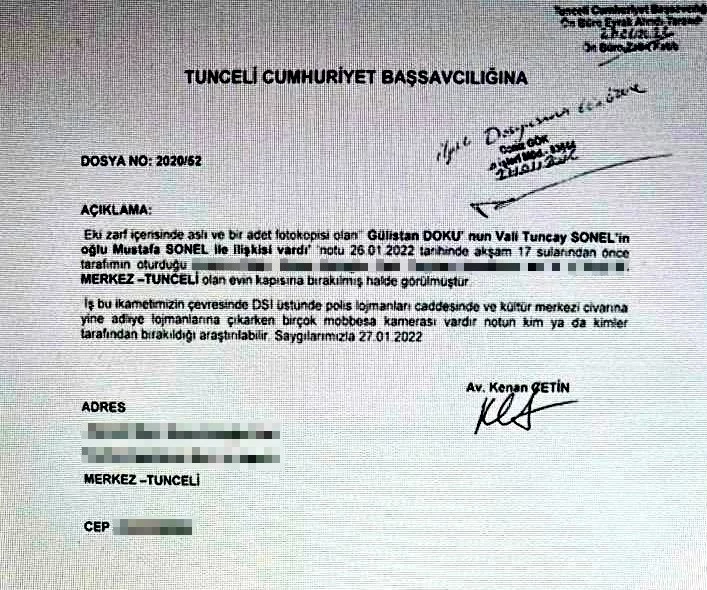 Buna göre dönemin Tunceli Barosu Başkanı Kenan Çetin'in şehirde bulunan evinin kapısına 26 Ocak 2026 akşamı bir not bırakıldı. Notta "Gülistan Doku'nun Vali Tuncay Sonel'in oğlu Mustafa Sonel ile ilişkisi vardı" ifadeleri yazıldı.