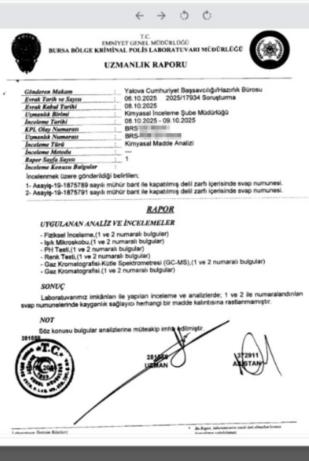 Yapılan kimyasal analizde alınan iki örnekte de kayganlık sağlayıcı herhangi bir maddeye rastlanmadığı bildirildi.