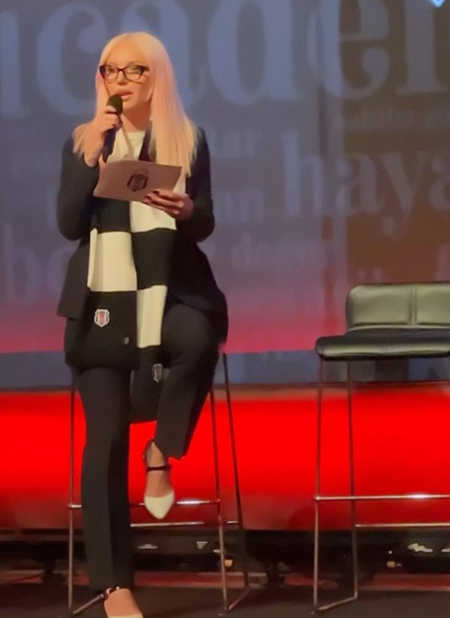 Konuşmacı olduğu etkinliğe siyah pantolon ve ceket takımı ile katılan Gülşen kombinini siyah çerçeveli gözlükleri ile tamamladı.