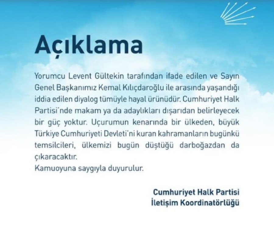 "Yorumcu Levent Gültekin tarafından ifade edilen ve Sayın Genel Başkanımız Kemal Kılıçdaroğlu ile arasında yaşandığı iddia edilen diyalog tümüyle hayal ürünüdür. Cumhuriyet Halk Partisi'nde makam ya da adaylıkları dışarıdan belirleyecek bir güç yoktur. Uçurumun kenarında bir ülkeden, büyük Türkiye Cumhuriyeti Devleti'ni kuran kahramanların bugünkü temsilcileri, ülkemizi bugün düştüğü darboğazdan da çıkaracaktır. Kamuoyuna saygıyla duyurulur"