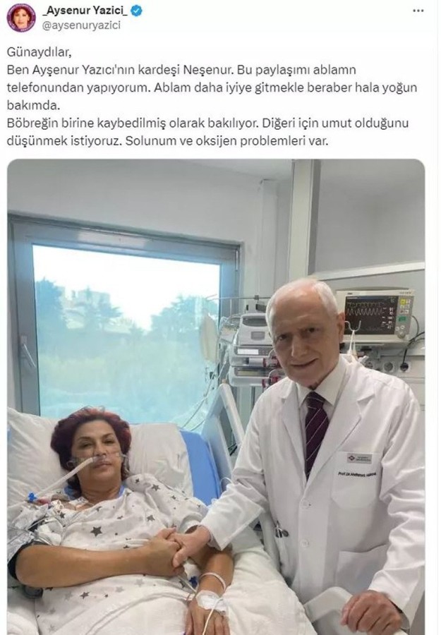 Yazıcı'nın kız kardeşi sosyal medya üzerinden yaptığı paylaşımda; "Ben Ayşenur Yazıcı'nın kardeşi Neşenur. Bu paylaşımı ablamın telefonundan yapıyorum. Ablam daha iyiye gitmekle beraber hala yoğun bakımda. Böbreğin birine kaybedilmiş olarak bakılıyor. Diğeri için umut olduğunu düşünmek istiyoruz. Solunum ve oksijen problemleri var" ifadelerini kullandı.
