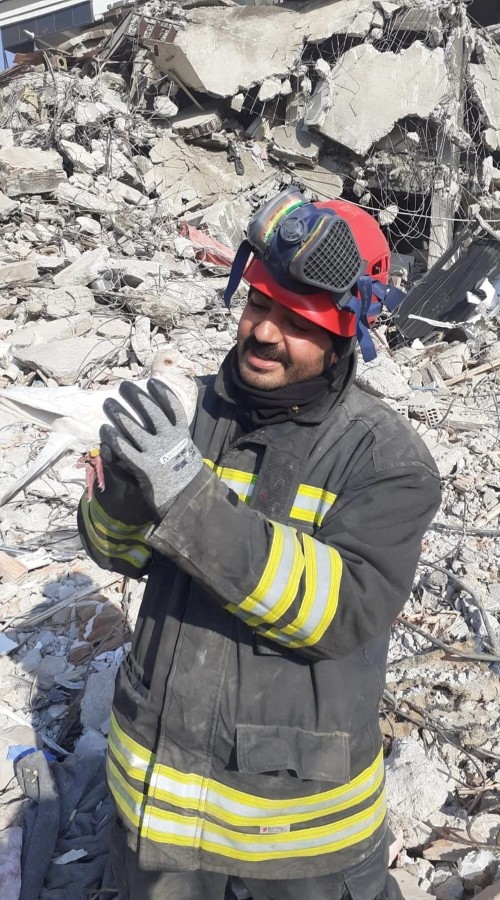 Hatay'da çalışmalarını sürdüren itfaiye ekipleri, uçarak enkazdaki yuvasına giren güvercinleri çıkardı. Yuvada ölen yavru güvercinler de bulundukları enkazdan çıkarıldı.