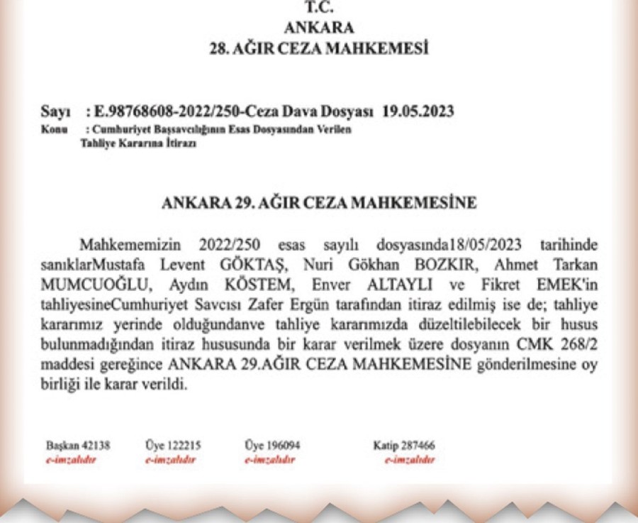 Davanın savcısı Zafer Ergül, karara itiraz etti. İtirazı reddeden Ankara 29. Ağır ceza mahkemesi, verilen tahliye kararlarını hukuka uygun olduğuna karar verdi.