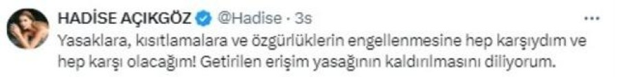 Ünlü şarkıcı X (twitter) üzerinden yaptığı paylaşımda 'Yasaklara, kısıtlamalara ve özgürlüklerin engellenmesine hep karşıydım ve hep karşı olacağım! Getirilen erişim yasağının kaldırılmasını diliyorum.' ifadelerini kullandı.