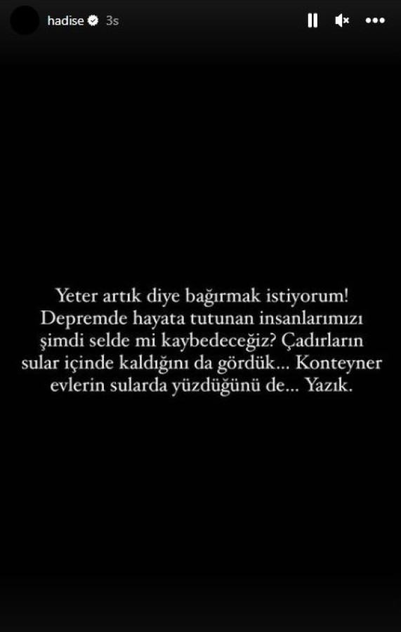 Şarkıcı Hadise Açıkgöz, Şanlıurfa ve Adıyaman'da meydana gelen sel felaketinde yaşanan can kayıpları üzerine tepki gösterdi.