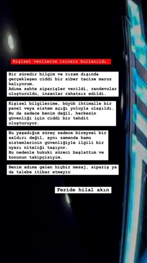 "Bu yaşadığım bu süreç, yalnızca bireysel bir saldırı değil, aynı zamanda kamu sistemlerinin güvenliğiyle ilgili bir uyarıdır. Hukuki süreci başlattım ve konunun takipçisiyim. Benim adıma gelen hiçbir mesaj, sipariş veya talebe itibar etmeyin."