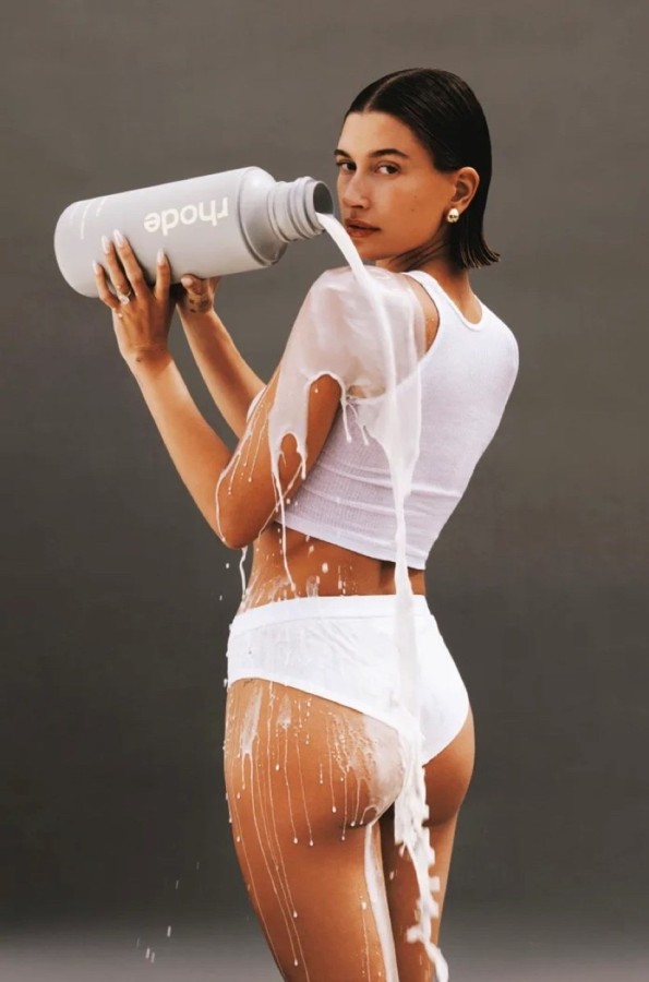 Promosyon kampanyası görsellerinde Hailey Bieber, modellik yeteneğini gösterdi. Bieber, sade beyaz bir atlet ve iç çamaşırlı haliyle Rhode Glazing Milk'i üzerine dökerken görülüyor.