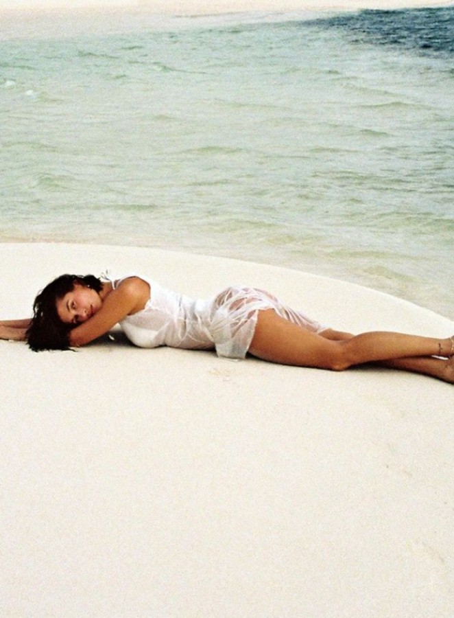 Minik bikinisiyle kumsalda sere serpe uzanan Bieber iddialı pozlarıyla beğeni topladı.