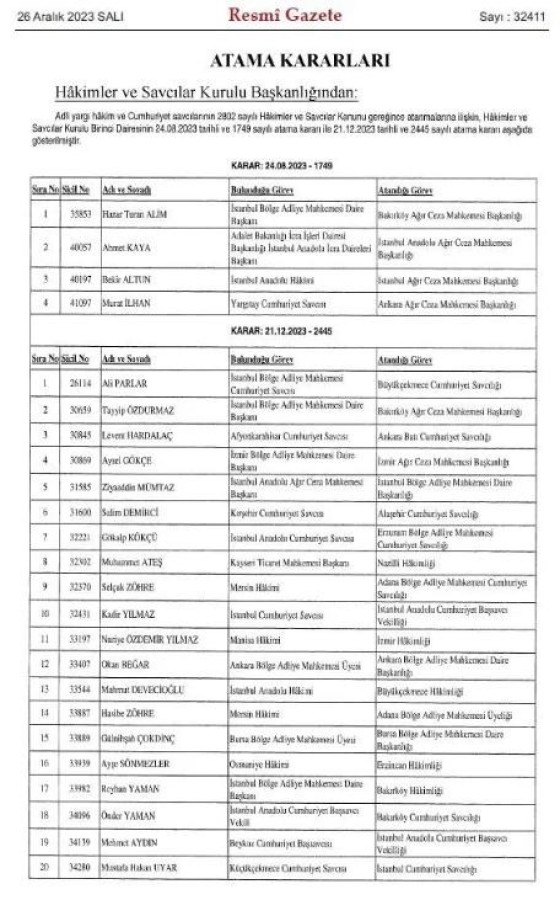 Hakimler ve Savcılar Kurulunun (HSK) adli ve idari yargıdaki atama kararnamesi Resmi Gazete'de yayımlanarak yürürlüğe girdi.