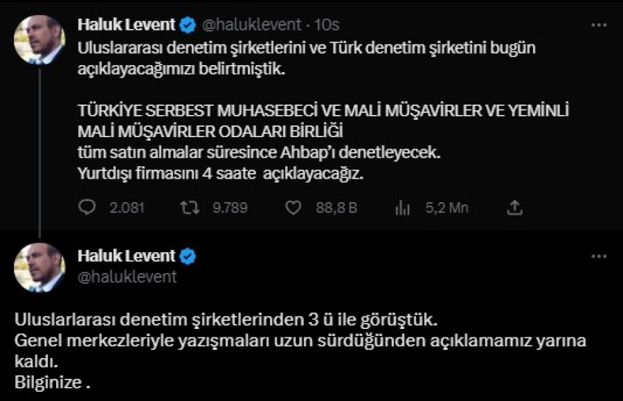 "Uluslararası denetim şirketlerini ve Türk denetim şirketini bugün açıklayacağımızı belirtmiştik. Türkiye Serbest Muhasebeci ve Mali Müşavirler ve Yeminli Mali Müşavirler Odaları Birliği tüm satın almalar süresince Ahbap'ı denetleyecek. Yurtdışı firmasını 4 saate açıklayacağız."