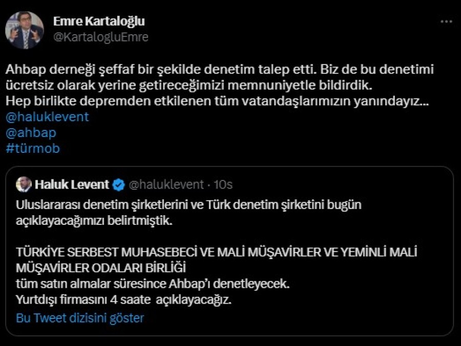 TÜRMOB Genel Başkanı Emre Kartaloğlu da denetimi ücretsiz olarak yapacaklarını belirterek, "Ahbap Derneği şeffaf bir şekilde denetim talep etti. Biz de bu denetimi ücretsiz olarak yerine getireceğimizi memnuniyetle bildirdik. Hep birlikte depremden etkilenen tüm vatandaşlarımızın yanındayız..." dedi.