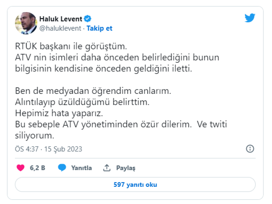 RTÜK başkanı ile görüşen Haluk Levent, "ATV'nin isimleri daha önceden belirlediğini, bunun bilgisinin kendisine önceden geldiğini iletti" dedi. "Hepimiz hata yaparız" diyen Levent, eski tweetini silerek ATV yönetiminden özür diledi.