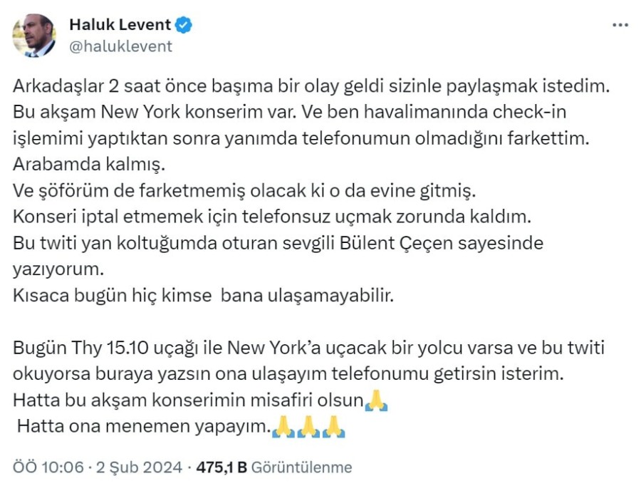 New York'taki konserine gitmek için havalimanında check-in işlemini yaptıktan sonra telefonunu arabada unuttuğunu fark eden şarkıcı Haluk Levent, sosyal medya üzerinden yardım istedi.