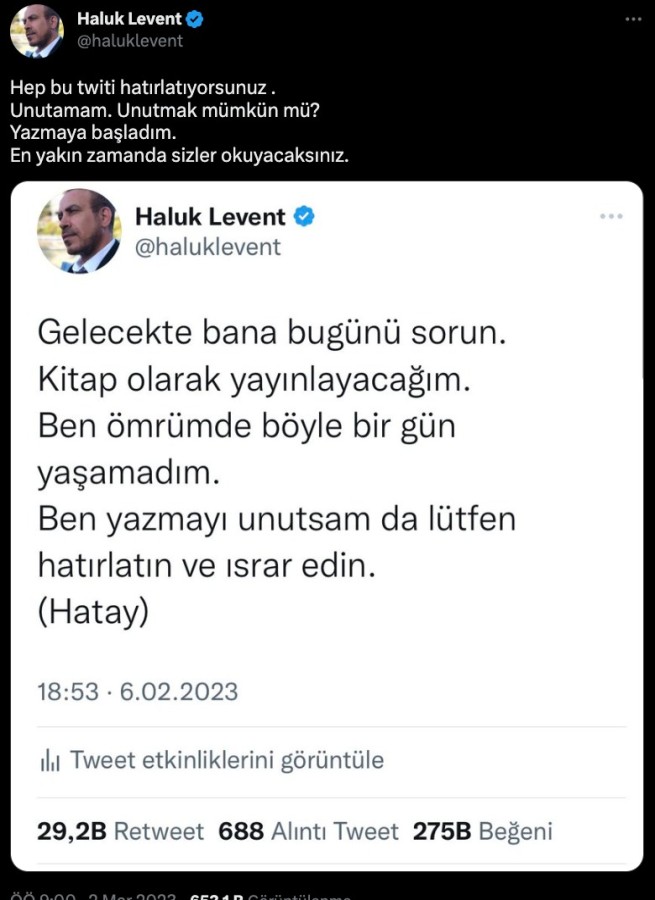 Depremlerin gerçekleştiği 6 Şubat 2023'te attığı "Gelecekte bana bugünü sorun. Kitap olarak yayınlayacağım. Ben ömrümde böyle bir gün yaşamadım. Ben yazmayı unutsam da lütfen hatırlatın ve ısrar edin (Hatay)" tweetini tekrar paylaşan Levent, şunları aktardı: