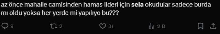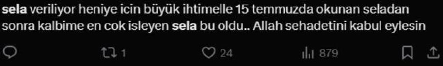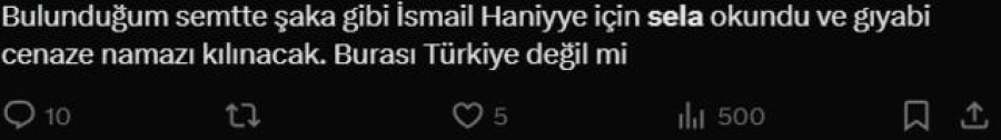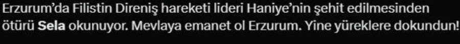 İran'da suikast ile öldürülen Hamas lideri İsmail Haniye için Türkiye genelinde camilerden sela sesleri yükseldi. Selayı duyanlar sosyal medyada birçok paylaşım yaptı.