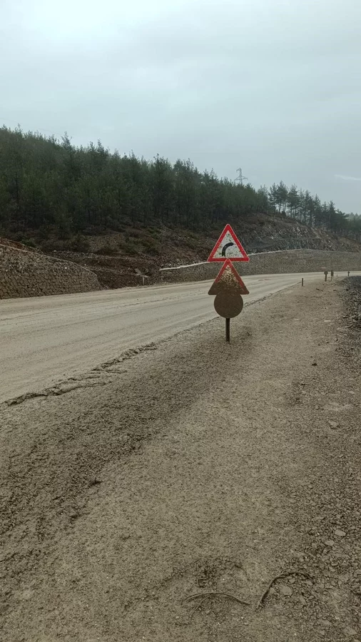 Yol çalışmaları ve sağanak yağış ile birlikte yol balçıkla kaplanırken, yol kenarlarındaki tabelalar çamurların sıçramasıyla görülmez duruma geldi.