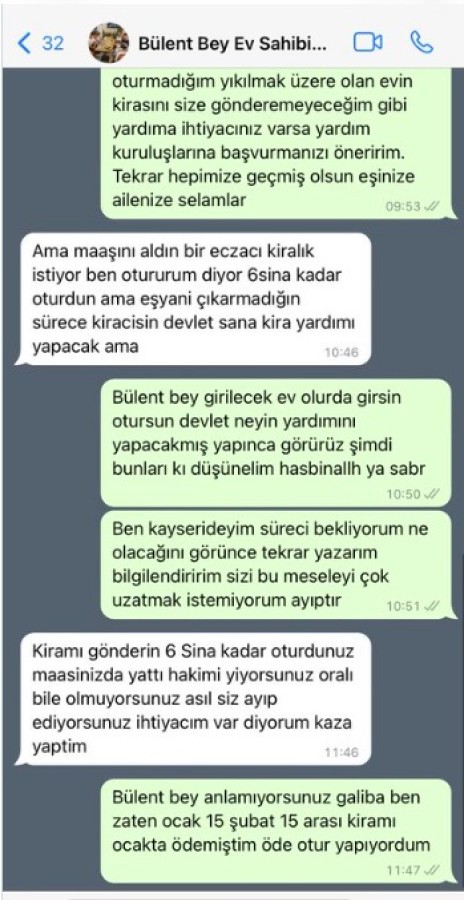 Kahramanmaraş merkezli 7.7 ve 7.6 büyüklüğündeki depremlerin yıkıma yol açtığı kentlerde can kaybı sürekli yükseliyor. Çevre, Şehircilik ve İklim Değişikliği Bakanı Murat Kurum, 18 Şubat'ta Gaziantep'te yaptığı açıklamada, 684 bin binanın incelendiğini, ağır hasarlı bina sayısının 90 bin 609 olduğunu söyledi. Devam eden artçı sarsıntılar nedeniyle insanlar "hasarsız" ya da "az hasarlı" binalarda kalamıyor. Depremin yaşandığı kentlerde kiracı olarak yaşamak zorunda olanların durumu ise muallakta. Kiracılar ile ev sahipleri arasında sıkıntılar yaşanıyor. Avukat Yankı Büyüksezer, 16 Şubat'ta depremzede bir vatandaşın ev sahibiyle yaşadığı sorunu Whatsapp diyaloğunu içeren mesajlaşmaya dair yaptığı paylaşımı alıntıladı. Paylaşımda evin hasarlı olmasına ve içinde oturulmamasına karşın ev sahibinin kirasını talep ettiği, kiracısının itirazına karşın halen içeride eşyasının bulunmasını gerekçe gösterdiği görülüyor.