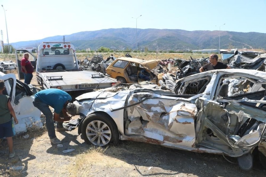 Depremin vurduğu Hatay'da enkaz altında kalarak hurdaya dönen araçlar, muhafaza altında bulundukları alanlardan araç sahipleri tarafından geri alınıyor.