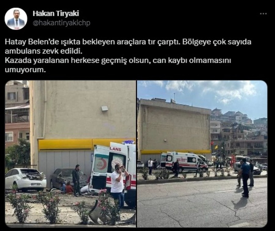 Cumhuriyet Halk Partisi Hatay İl Başkanı Hakan Tiryaki'nin yaptığı paylaşımda, "Hatay Belen'de ışıkta bekleyen araçlara tır çarptı. Bölgeye çok sayıda ambulans zevk edildi. Kazada yaralanan herkese geçmiş olsun, can kaybı olmamasını umuyorum" ifadelerini kullandı.