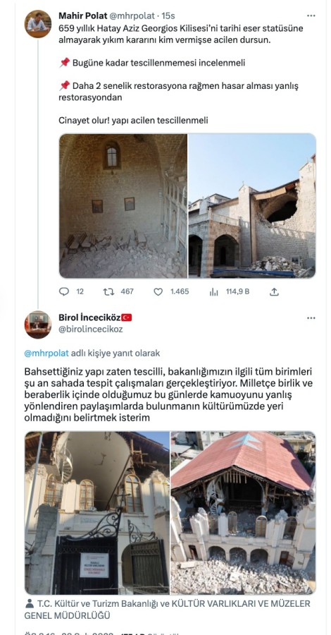 Mahir Polat, yıkım kararının durdurulması için çağrı yaptı, Kültür ve Turizm Bakanı Genel Müdürlüğü Yardımcısının ise Polat'a verdiği yanıtta kiliseleri karıştırdığı anlaşıldı.