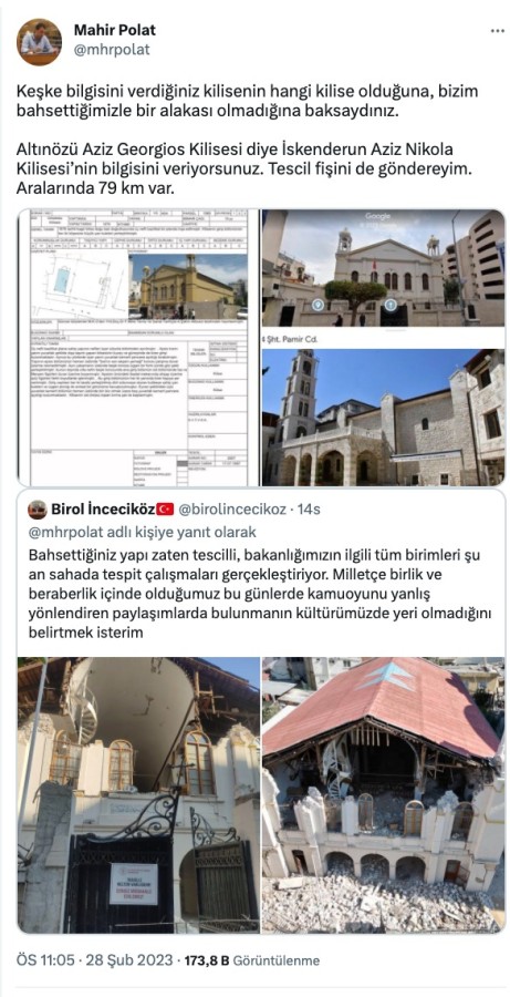 İnceciköz'ün bahsettiği yapı Aziz Nikola Kilisesi olduğu ortaya çıktı. Polat, "Keşke bilgisini verdiğiniz kilisenin hangi kilise olduğuna, bizim bahsettiğimizle bir alakası olmadığına baksaydınız. Altınözü Aziz Georgios Kilisesi diye İskenderun Aziz Nikola Kilisesi'nin bilgisini veriyorsunuz. Tescil fişini de göndereyim. Aralarında 79 km var" diye cevap verdi.