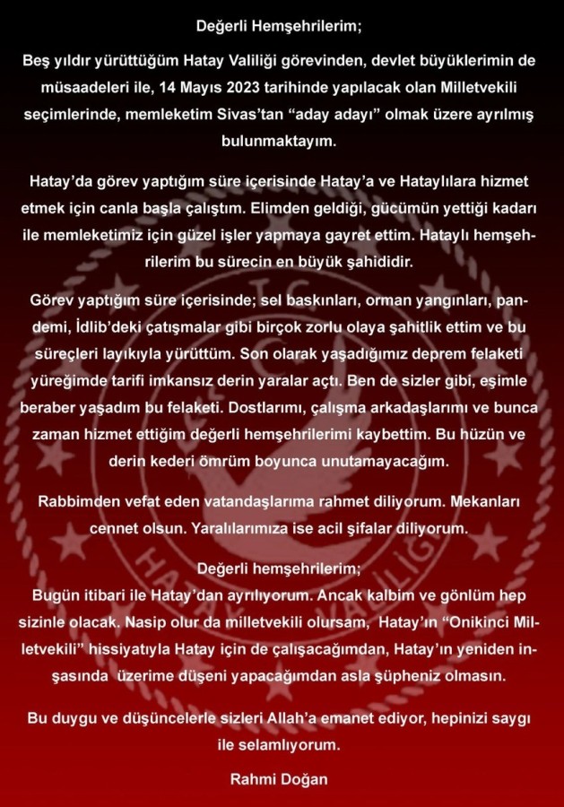 Hatay Valisi Rahmi Doğan, sosyal medya hesabından istifa ettiğini duyurdu. Doğan yaptığı paylaşımda "Beş yıldır yürüttüğüm Hatay Valiliği görevinden, devlet büyüklerimin de müsaadeleri ile 14 Mayıs'ta yapılacak olan milletvekili seçimlerinde, memleketim Sivas'tan 'aday adayı' olmak üzere ayrılmış bulunmaktayım" dedi.