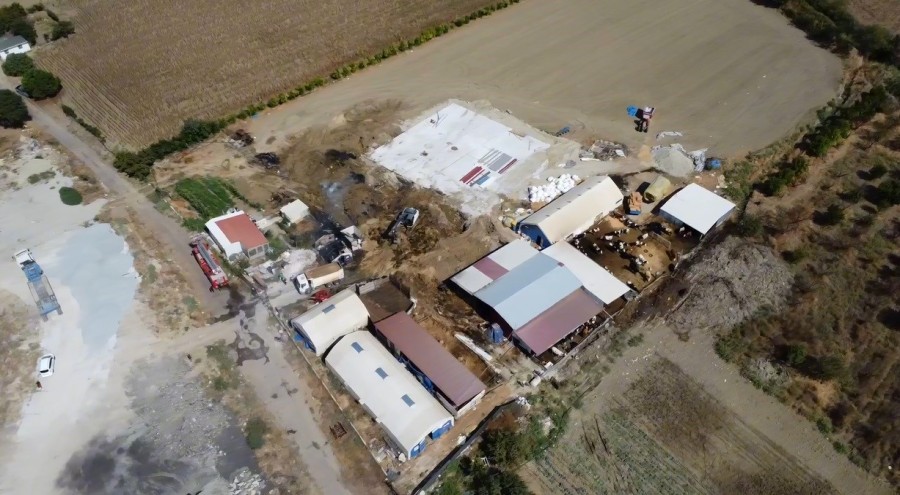 Hayvan damında ekiplerin yaptığı çalışmalar ise dron ile görüntülendi.