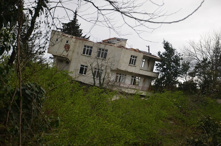 Ordu'da yaklaşık 4 yıl önce heyelan nedeniyle 10 binanın boşaltıldığı mahalledeki 2 katlı binanın, yeniden yaşanan heyelan sonrası yan yattığı gözlendi.