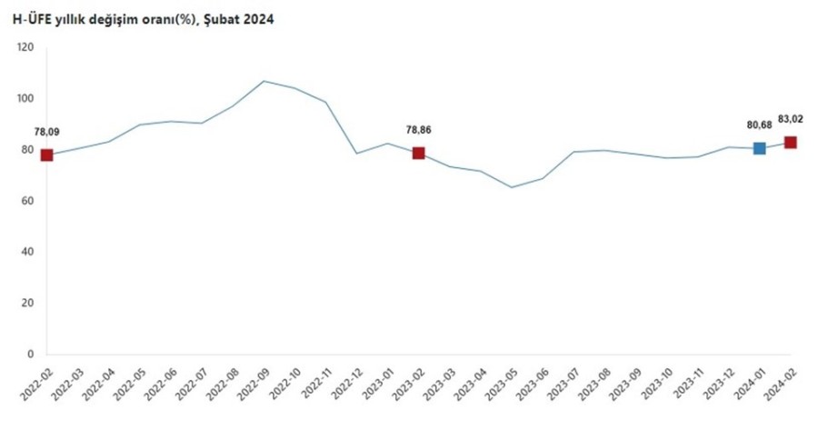 Türkiye İstatistik Kurumu, şubat ayına ilişkin H-ÜFE verilerini açıkladı. Buna göre, H-ÜFE, şubatta bir önceki aya kıyasla yüzde 2,94, geçen yılın aralık ayına göre yüzde 18,64, geçen yılın aynı ayına kıyasla yüzde 83,02 ve on iki aylık ortalamalara göre yüzde 77,02 arttı.Endeks, geçen yılın aynı ayına kıyasla ulaştırma ve depolama hizmetlerinde yüzde 76,49, konaklama ve yiyecek hizmetlerinde yüzde 90,16, bilgi ve iletişim hizmetlerinde yüzde 87,64, gayrimenkul hizmetlerinde yüzde 76,7, mesleki, bilimsel ve teknik hizmetlerde yüzde 87,23, idari ve destek hizmetlerinde yüzde 94,52 artış kaydetti.