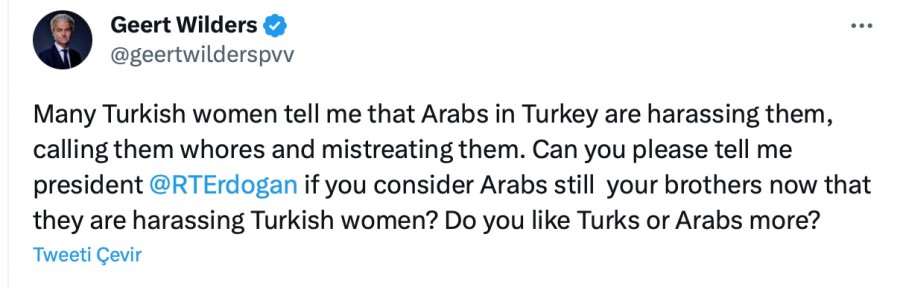 Daha önce de Cumhurbaşkanı Recep Tayyip Erdoğan'a karşı ifadeleriyle gündem olan Hollandalı aşırı sağcı siyasetçi, Twitter üzerinden yaptığı paylaşımda Cumhurbaşkanı Erdoğan'ı etiketleyerek "Türk kadınlarını taciz eden Arapları hala kardeşiniz olarak görüyor musunuz? Türkleri mi yoksa Arapları mı daha çok seviyorsunuz?" Diye sordu.