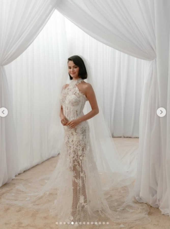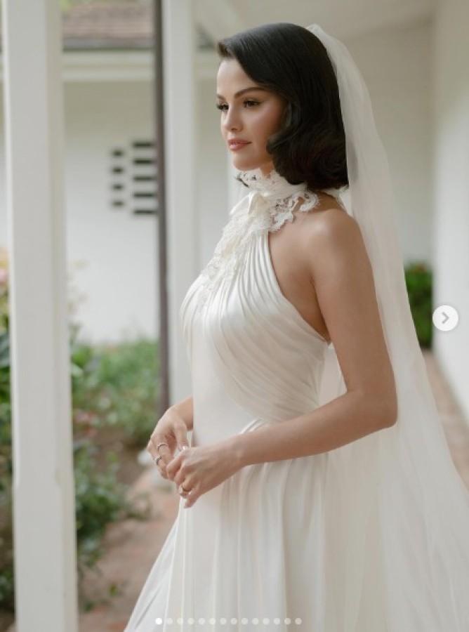 Ünlü yıldızın üzerinde, Ralph Lauren imzası taşıyan özel tasarım bir gelinlik yer aldı. Sırt dekolteli halter yaka gelinlik, ipek etekleri ve uzun tren detayıyla büyük beğeni toplarken, Gomez'in kısa bob saç modeli, sade makyajı ve zarif elmas küpeleriyle tamamladığı görünüm de oldukça beğenildi.
