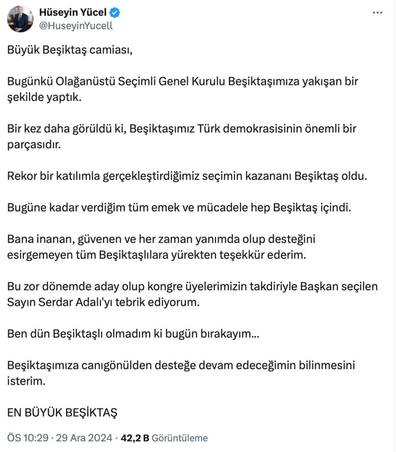 "Büyük Beşiktaş camiası, Bugünkü Olağanüstü Seçimli Genel Kurulu Beşiktaşımıza yakışan bir şekilde yaptık. Bir kez daha görüldü ki, Beşiktaşımız Türk demokrasisinin önemli bir parçasıdır. Rekor bir katılımla gerçekleştirdiğimiz seçimin kazananı Beşiktaş oldu. Bugüne kadar verdiğim tüm emek ve mücadele hep Beşiktaş içindi. Bana inanan, güvenen ve her zaman yanımda olup desteğini esirgemeyen tüm Beşiktaşlılara yürekten teşekkür ederim. Bu zor dönemde aday olup kongre üyelerimizin takdiriyle Başkan seçilen Sayın Serdar Adalı'yı tebrik ediyorum. Ben dün Beşiktaşlı olmadım ki bugün bırakayım... Beşiktaşımıza canıgönülden desteğe devam edeceğimin bilinmesini isterim. EN BÜYÜK BEŞİKTAŞ"