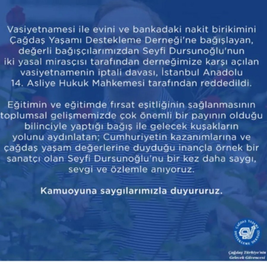 Çağdaş Yaşamı Destekleme Derneği, yaptığı açıklamada mahkemenin kararını duyurdu. Dernek yaptığı açıklamada şu ifadelere yer verdi: