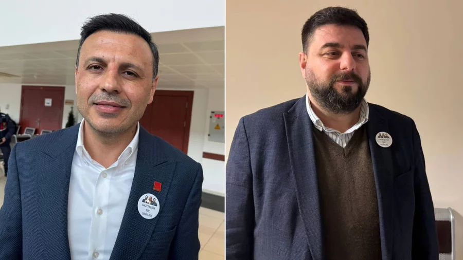 CHP İstanbul İl Başkanı Özgür Çelik ve Hasan İmamoğlu'nun avukatı İsmail Emre Telci, İBB Davası'nı gazetecilerin tutuklu arkadaşları için yaptırdığı "Gazetecilik Suç Değildir" rozetleriyle takip ediyor.